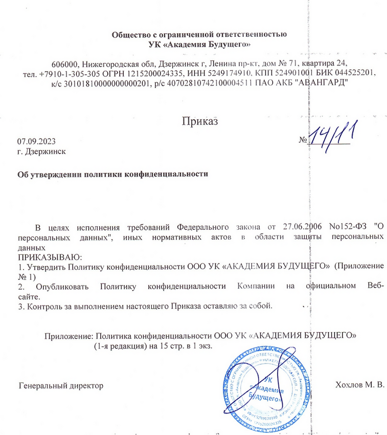 Настоящая политика обработки персональных данных составлена в соответствии с требованиями Федерального закона от 27.07.2006. № 152-ФЗ «О персональных данных» (далее — Закон о персональных данных) и определяет порядок обработки персональных данных и меры по обеспечению безопасности персональных данных, предпринимаемые ООО УК «АКАДЕМИЯ БУДУЩЕГО» ИНН: 5249174910, КПП 524901001, ОГРН: 1215200024335, индекс: 606000, Нижегородская обл., г.Дзержинск, пр.Ленина, д.71, кв.24 (далее — Оператор).